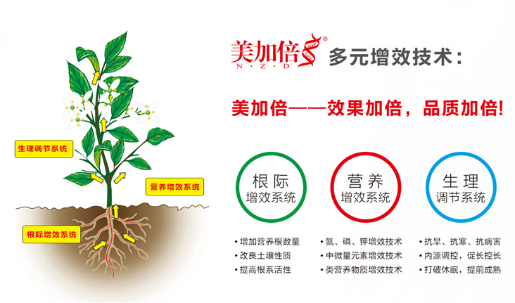 輸和吸收效率的多元增效系統(tǒng)。美加倍?多元增效系統(tǒng)由根際增效系統(tǒng)、營(yíng)養(yǎng)增效系統(tǒng)和