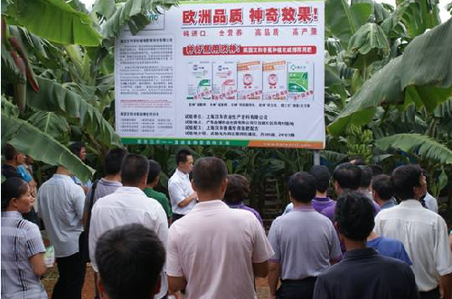 親自參與本次產品試驗的宛飛博士向嘉賓詳細介紹了示范區用肥情況,重點介紹了上海漢和歐神營養套餐的技術原理和使用方法。據悉,用于本次試驗的肥料全部來自上海漢和的“歐神”系列肥料,為了科學嚴謹的驗證 “歐神”產品效果,試驗前仔細篩選南寧本地有代表性的蕉園土壤做樣本,分析其土壤的PH值,有機質、NPK等營養成分的含量,并參考本地的光照、溫度、濕度等因素精心制訂營養套餐施用方案:在香蕉移苗時使用歐神鈣鎂硼鋅鐵配合有機肥、復合肥做底肥;花芽分化前期,使用歐神硝酸鉀配合歐神鈣鎂硼鋅鐵,可以加強香蕉根系活力,促進須根生長及養分的吸收;在花芽分化期噴施微硼和歐神鈣爾鎂及護蕾期噴施微硼和鈣鋅液,起到促進花芽分化及拉長果指的效果;花芽分化后期及抽蕾后使用歐神硝酸鉀和硫酸鉀配方,有利于促進果指迅速膨大。