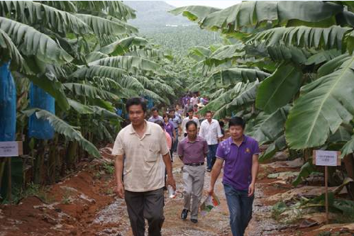 香蕉種植大戶在金穗公司工作人員的引領下進入“歐神”產品試驗示范區