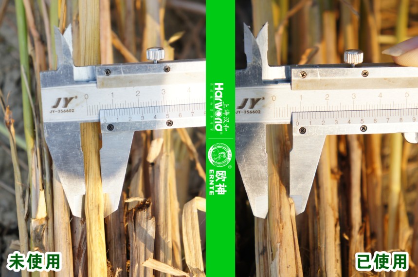 10月下旬水稻收割時,為了對這次試驗作出科學的評估和測產,唐老板請技術人員現場評測,并邀請當地的種植大戶前來觀摩和見證。此次測評的樣品全部由來觀摩的大戶現場隨機抽選,客觀性強、可信度高。經過專業技術人員的儀器測量和目測,試驗田水稻莖稈粗壯、挺直,沒有倒伏的現象,劍葉更綠,谷子更飽滿,有效谷粒多,稻穗與對比稻穗對比長2-3公分;在稻穗主穗的對比上,試驗田的五主穗的重量是41.5克,對照田的僅有30.5克;在抗倒伏測試上,用手握住水稻中部,試驗田的水稻頭部彎曲5度,對照田的則彎曲達到40度;在產量上,試驗田達到1173斤/畝,對照田901斤/畝,高出272斤,增產幅度達30.19%。