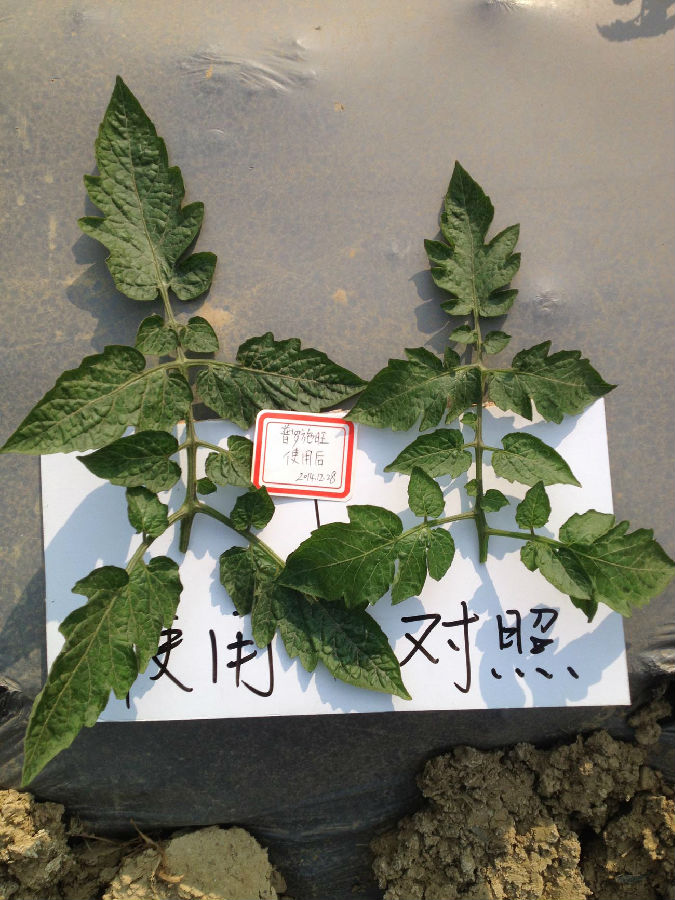 4.葉片的對比:同一生長階段的葉片進(jìn)行對比,試驗(yàn)區(qū)葉片明顯較大,更厚、更綠,葉脈粗壯;對照區(qū)葉片明顯較小,較薄、顏色較黃,葉脈較細(xì)。如下圖: