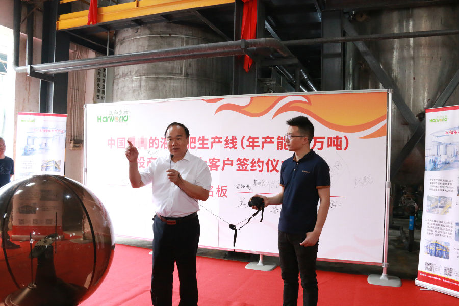 董事長梁承給參會來賓講解漢和液體肥生產線的性能指標、生產運行情況。
